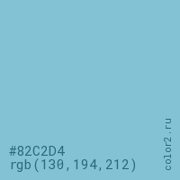 Цвет #82C2D4 в цветовой модели RGB обозначается тремя октетами (130, 194, 212) в десятичном формате и #82C2D4 в шестнадцатиричном (hex) формате, которые являются интенсивностью красного 130 (hex 82), интенсивность зелёного 194 (hex C2) и интенсивность синего 212 (hex D4).