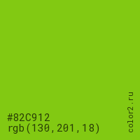 Цвет #82C912 в цветовой модели RGB обозначается тремя октетами (130, 201, 18) в десятичном формате и #82C912 в шестнадцатиричном (hex) формате, которые являются интенсивностью красного 130 (hex 82), интенсивность зелёного 201 (hex C9) и интенсивность синего 18 (hex 12).
