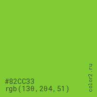 Цвет #82CC33 в цветовой модели RGB обозначается тремя октетами (130, 204, 51) в десятичном формате и #82CC33 в шестнадцатиричном (hex) формате, которые являются интенсивностью красного 130 (hex 82), интенсивность зелёного 204 (hex CC) и интенсивность синего 51 (hex 33).