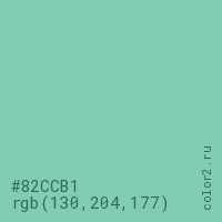 Цвет #82CCB1 в цветовой модели RGB обозначается тремя октетами (130, 204, 177) в десятичном формате и #82CCB1 в шестнадцатиричном (hex) формате, которые являются интенсивностью красного 130 (hex 82), интенсивность зелёного 204 (hex CC) и интенсивность синего 177 (hex B1).