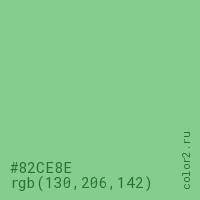 Цвет #82CE8E в цветовой модели RGB обозначается тремя октетами (130, 206, 142) в десятичном формате и #82CE8E в шестнадцатиричном (hex) формате, которые являются интенсивностью красного 130 (hex 82), интенсивность зелёного 206 (hex CE) и интенсивность синего 142 (hex 8E).