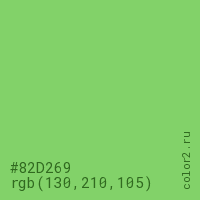 Цвет #82D269 в цветовой модели RGB обозначается тремя октетами (130, 210, 105) в десятичном формате и #82D269 в шестнадцатиричном (hex) формате, которые являются интенсивностью красного 130 (hex 82), интенсивность зелёного 210 (hex D2) и интенсивность синего 105 (hex 69).