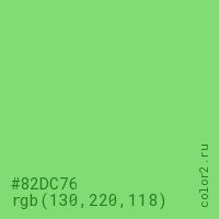 Цвет #82DC76 в цветовой модели RGB обозначается тремя октетами (130, 220, 118) в десятичном формате и #82DC76 в шестнадцатиричном (hex) формате, которые являются интенсивностью красного 130 (hex 82), интенсивность зелёного 220 (hex DC) и интенсивность синего 118 (hex 76).