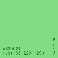 Цвет #82DC81 в цветовой модели RGB обозначается тремя октетами (130, 220, 129) в десятичном формате и #82DC81 в шестнадцатиричном (hex) формате, которые являются интенсивностью красного 130 (hex 82), интенсивность зелёного 220 (hex DC) и интенсивность синего 129 (hex 81).