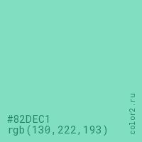 Цвет #82DEC1 в цветовой модели RGB обозначается тремя октетами (130, 222, 193) в десятичном формате и #82DEC1 в шестнадцатиричном (hex) формате, которые являются интенсивностью красного 130 (hex 82), интенсивность зелёного 222 (hex DE) и интенсивность синего 193 (hex C1).