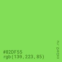 Цвет #82DF55 в цветовой модели RGB обозначается тремя октетами (130, 223, 85) в десятичном формате и #82DF55 в шестнадцатиричном (hex) формате, которые являются интенсивностью красного 130 (hex 82), интенсивность зелёного 223 (hex DF) и интенсивность синего 85 (hex 55).