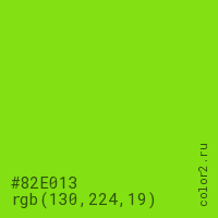 Цвет #82E013 в цветовой модели RGB обозначается тремя октетами (130, 224, 19) в десятичном формате и #82E013 в шестнадцатиричном (hex) формате, которые являются интенсивностью красного 130 (hex 82), интенсивность зелёного 224 (hex E0) и интенсивность синего 19 (hex 13).