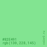 Цвет #82E491 в цветовой модели RGB обозначается тремя октетами (130, 228, 145) в десятичном формате и #82E491 в шестнадцатиричном (hex) формате, которые являются интенсивностью красного 130 (hex 82), интенсивность зелёного 228 (hex E4) и интенсивность синего 145 (hex 91).