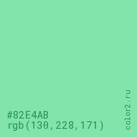 Цвет #82E4AB в цветовой модели RGB обозначается тремя октетами (130, 228, 171) в десятичном формате и #82E4AB в шестнадцатиричном (hex) формате, которые являются интенсивностью красного 130 (hex 82), интенсивность зелёного 228 (hex E4) и интенсивность синего 171 (hex AB).