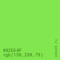 Цвет #82E64F в цветовой модели RGB обозначается тремя октетами (130, 230, 79) в десятичном формате и #82E64F в шестнадцатиричном (hex) формате, которые являются интенсивностью красного 130 (hex 82), интенсивность зелёного 230 (hex E6) и интенсивность синего 79 (hex 4F).