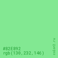 Цвет #82E892 в цветовой модели RGB обозначается тремя октетами (130, 232, 146) в десятичном формате и #82E892 в шестнадцатиричном (hex) формате, которые являются интенсивностью красного 130 (hex 82), интенсивность зелёного 232 (hex E8) и интенсивность синего 146 (hex 92).
