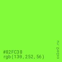 Цвет #82FC38 в цветовой модели RGB обозначается тремя октетами (130, 252, 56) в десятичном формате и #82FC38 в шестнадцатиричном (hex) формате, которые являются интенсивностью красного 130 (hex 82), интенсивность зелёного 252 (hex FC) и интенсивность синего 56 (hex 38).