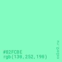 Цвет #82FCBE в цветовой модели RGB обозначается тремя октетами (130, 252, 190) в десятичном формате и #82FCBE в шестнадцатиричном (hex) формате, которые являются интенсивностью красного 130 (hex 82), интенсивность зелёного 252 (hex FC) и интенсивность синего 190 (hex BE).