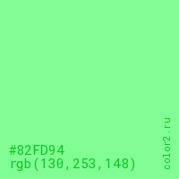 Цвет #82FD94 в цветовой модели RGB обозначается тремя октетами (130, 253, 148) в десятичном формате и #82FD94 в шестнадцатиричном (hex) формате, которые являются интенсивностью красного 130 (hex 82), интенсивность зелёного 253 (hex FD) и интенсивность синего 148 (hex 94).