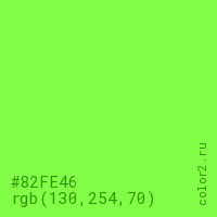 Цвет #82FE46 в цветовой модели RGB обозначается тремя октетами (130, 254, 70) в десятичном формате и #82FE46 в шестнадцатиричном (hex) формате, которые являются интенсивностью красного 130 (hex 82), интенсивность зелёного 254 (hex FE) и интенсивность синего 70 (hex 46).