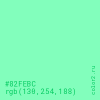 Цвет #82FEBC в цветовой модели RGB обозначается тремя октетами (130, 254, 188) в десятичном формате и #82FEBC в шестнадцатиричном (hex) формате, которые являются интенсивностью красного 130 (hex 82), интенсивность зелёного 254 (hex FE) и интенсивность синего 188 (hex BC).