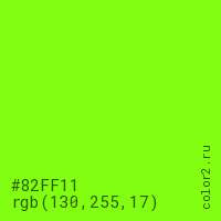 Цвет #82FF11 в цветовой модели RGB обозначается тремя октетами (130, 255, 17) в десятичном формате и #82FF11 в шестнадцатиричном (hex) формате, которые являются интенсивностью красного 130 (hex 82), интенсивность зелёного 255 (hex FF) и интенсивность синего 17 (hex 11).