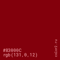 Цвет #83000C в цветовой модели RGB обозначается тремя октетами (131, 0, 12) в десятичном формате и #83000C в шестнадцатиричном (hex) формате, которые являются интенсивностью красного 131 (hex 83), интенсивность зелёного 0 (hex 00) и интенсивность синего 12 (hex 0C).