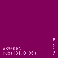 Цвет #83005A в цветовой модели RGB обозначается тремя октетами (131, 0, 90) в десятичном формате и #83005A в шестнадцатиричном (hex) формате, которые являются интенсивностью красного 131 (hex 83), интенсивность зелёного 0 (hex 00) и интенсивность синего 90 (hex 5A).