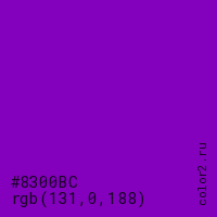 Цвет #8300BC в цветовой модели RGB обозначается тремя октетами (131, 0, 188) в десятичном формате и #8300BC в шестнадцатиричном (hex) формате, которые являются интенсивностью красного 131 (hex 83), интенсивность зелёного 0 (hex 00) и интенсивность синего 188 (hex BC).