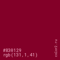 Цвет #830129 в цветовой модели RGB обозначается тремя октетами (131, 1, 41) в десятичном формате и #830129 в шестнадцатиричном (hex) формате, которые являются интенсивностью красного 131 (hex 83), интенсивность зелёного 1 (hex 01) и интенсивность синего 41 (hex 29).