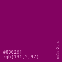 Цвет #830261 в цветовой модели RGB обозначается тремя октетами (131, 2, 97) в десятичном формате и #830261 в шестнадцатиричном (hex) формате, которые являются интенсивностью красного 131 (hex 83), интенсивность зелёного 2 (hex 02) и интенсивность синего 97 (hex 61).