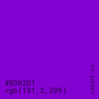 Цвет #8302D1 в цветовой модели RGB обозначается тремя октетами (131, 2, 209) в десятичном формате и #8302D1 в шестнадцатиричном (hex) формате, которые являются интенсивностью красного 131 (hex 83), интенсивность зелёного 2 (hex 02) и интенсивность синего 209 (hex D1).