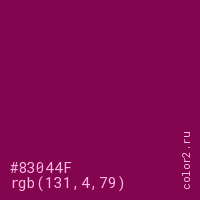 Цвет #83044F в цветовой модели RGB обозначается тремя октетами (131, 4, 79) в десятичном формате и #83044F в шестнадцатиричном (hex) формате, которые являются интенсивностью красного 131 (hex 83), интенсивность зелёного 4 (hex 04) и интенсивность синего 79 (hex 4F).