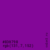 Цвет #830798 в цветовой модели RGB обозначается тремя октетами (131, 7, 152) в десятичном формате и #830798 в шестнадцатиричном (hex) формате, которые являются интенсивностью красного 131 (hex 83), интенсивность зелёного 7 (hex 07) и интенсивность синего 152 (hex 98).