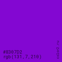 Цвет #8307D2 в цветовой модели RGB обозначается тремя октетами (131, 7, 210) в десятичном формате и #8307D2 в шестнадцатиричном (hex) формате, которые являются интенсивностью красного 131 (hex 83), интенсивность зелёного 7 (hex 07) и интенсивность синего 210 (hex D2).