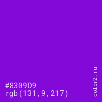 Цвет #8309D9 в цветовой модели RGB обозначается тремя октетами (131, 9, 217) в десятичном формате и #8309D9 в шестнадцатиричном (hex) формате, которые являются интенсивностью красного 131 (hex 83), интенсивность зелёного 9 (hex 09) и интенсивность синего 217 (hex D9).
