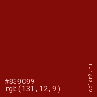 Цвет #830C09 в цветовой модели RGB обозначается тремя октетами (131, 12, 9) в десятичном формате и #830C09 в шестнадцатиричном (hex) формате, которые являются интенсивностью красного 131 (hex 83), интенсивность зелёного 12 (hex 0C) и интенсивность синего 9 (hex 09).