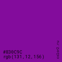 Цвет #830C9C в цветовой модели RGB обозначается тремя октетами (131, 12, 156) в десятичном формате и #830C9C в шестнадцатиричном (hex) формате, которые являются интенсивностью красного 131 (hex 83), интенсивность зелёного 12 (hex 0C) и интенсивность синего 156 (hex 9C).