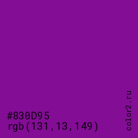 Цвет #830D95 в цветовой модели RGB обозначается тремя октетами (131, 13, 149) в десятичном формате и #830D95 в шестнадцатиричном (hex) формате, которые являются интенсивностью красного 131 (hex 83), интенсивность зелёного 13 (hex 0D) и интенсивность синего 149 (hex 95).