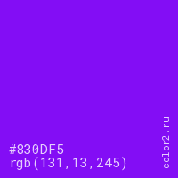 Цвет #830DF5 в цветовой модели RGB обозначается тремя октетами (131, 13, 245) в десятичном формате и #830DF5 в шестнадцатиричном (hex) формате, которые являются интенсивностью красного 131 (hex 83), интенсивность зелёного 13 (hex 0D) и интенсивность синего 245 (hex F5).