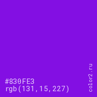 Цвет #830FE3 в цветовой модели RGB обозначается тремя октетами (131, 15, 227) в десятичном формате и #830FE3 в шестнадцатиричном (hex) формате, которые являются интенсивностью красного 131 (hex 83), интенсивность зелёного 15 (hex 0F) и интенсивность синего 227 (hex E3).