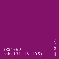Цвет #831069 в цветовой модели RGB обозначается тремя октетами (131, 16, 105) в десятичном формате и #831069 в шестнадцатиричном (hex) формате, которые являются интенсивностью красного 131 (hex 83), интенсивность зелёного 16 (hex 10) и интенсивность синего 105 (hex 69).