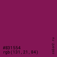 Цвет #831554 в цветовой модели RGB обозначается тремя октетами (131, 21, 84) в десятичном формате и #831554 в шестнадцатиричном (hex) формате, которые являются интенсивностью красного 131 (hex 83), интенсивность зелёного 21 (hex 15) и интенсивность синего 84 (hex 54).