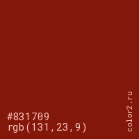 Цвет #831709 в цветовой модели RGB обозначается тремя октетами (131, 23, 9) в десятичном формате и #831709 в шестнадцатиричном (hex) формате, которые являются интенсивностью красного 131 (hex 83), интенсивность зелёного 23 (hex 17) и интенсивность синего 9 (hex 09).