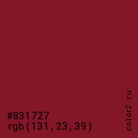 Цвет #831727 в цветовой модели RGB обозначается тремя октетами (131, 23, 39) в десятичном формате и #831727 в шестнадцатиричном (hex) формате, которые являются интенсивностью красного 131 (hex 83), интенсивность зелёного 23 (hex 17) и интенсивность синего 39 (hex 27).