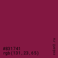 Цвет #831741 в цветовой модели RGB обозначается тремя октетами (131, 23, 65) в десятичном формате и #831741 в шестнадцатиричном (hex) формате, которые являются интенсивностью красного 131 (hex 83), интенсивность зелёного 23 (hex 17) и интенсивность синего 65 (hex 41).