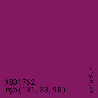 Цвет #831762 в цветовой модели RGB обозначается тремя октетами (131, 23, 98) в десятичном формате и #831762 в шестнадцатиричном (hex) формате, которые являются интенсивностью красного 131 (hex 83), интенсивность зелёного 23 (hex 17) и интенсивность синего 98 (hex 62).