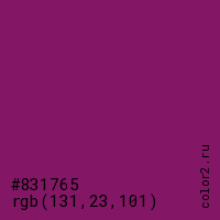 Цвет #831765 в цветовой модели RGB обозначается тремя октетами (131, 23, 101) в десятичном формате и #831765 в шестнадцатиричном (hex) формате, которые являются интенсивностью красного 131 (hex 83), интенсивность зелёного 23 (hex 17) и интенсивность синего 101 (hex 65).