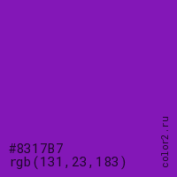 Цвет #8317B7 в цветовой модели RGB обозначается тремя октетами (131, 23, 183) в десятичном формате и #8317B7 в шестнадцатиричном (hex) формате, которые являются интенсивностью красного 131 (hex 83), интенсивность зелёного 23 (hex 17) и интенсивность синего 183 (hex B7).