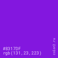 Цвет #8317DF в цветовой модели RGB обозначается тремя октетами (131, 23, 223) в десятичном формате и #8317DF в шестнадцатиричном (hex) формате, которые являются интенсивностью красного 131 (hex 83), интенсивность зелёного 23 (hex 17) и интенсивность синего 223 (hex DF).