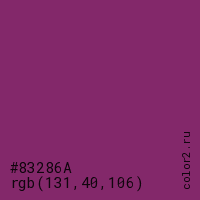 Цвет #83286A в цветовой модели RGB обозначается тремя октетами (131, 40, 106) в десятичном формате и #83286A в шестнадцатиричном (hex) формате, которые являются интенсивностью красного 131 (hex 83), интенсивность зелёного 40 (hex 28) и интенсивность синего 106 (hex 6A).