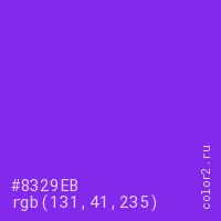 Цвет #8329EB в цветовой модели RGB обозначается тремя октетами (131, 41, 235) в десятичном формате и #8329EB в шестнадцатиричном (hex) формате, которые являются интенсивностью красного 131 (hex 83), интенсивность зелёного 41 (hex 29) и интенсивность синего 235 (hex EB).