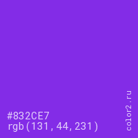 Цвет #832CE7 в цветовой модели RGB обозначается тремя октетами (131, 44, 231) в десятичном формате и #832CE7 в шестнадцатиричном (hex) формате, которые являются интенсивностью красного 131 (hex 83), интенсивность зелёного 44 (hex 2C) и интенсивность синего 231 (hex E7).