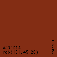 Цвет #832D14 в цветовой модели RGB обозначается тремя октетами (131, 45, 20) в десятичном формате и #832D14 в шестнадцатиричном (hex) формате, которые являются интенсивностью красного 131 (hex 83), интенсивность зелёного 45 (hex 2D) и интенсивность синего 20 (hex 14).