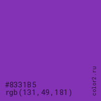 Цвет #8331B5 в цветовой модели RGB обозначается тремя октетами (131, 49, 181) в десятичном формате и #8331B5 в шестнадцатиричном (hex) формате, которые являются интенсивностью красного 131 (hex 83), интенсивность зелёного 49 (hex 31) и интенсивность синего 181 (hex B5).